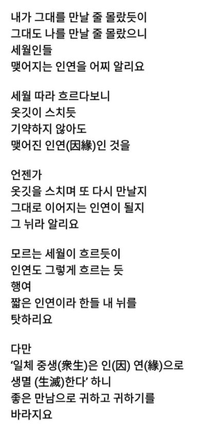 그러려니 하고 살자.. 인생길에 내 마음 꼭 맞는 사람이 어디있으리 난들 누구 마음에 그리 꼭 맞으리 그러려니 하고 살자 내 귀에 들리는 말들 어찌 다 좋게만 들리랴 내 말도 더러는 남의 귀에 거슬리리니 그러려니 하고 살자 세상이 어찌 내 마음을 꼭 맞추어 주랴 마땅찮은 일 있어도 세상은 다 그런 거려니 하고 살자 누가 비난했다고 분노하거나 서운해 하지 말자 부족한데도 격려하고 세워주는 사람도 있지 않던가 그러려니 하고 살자 사랑하는 사람을 보냈다고 너무 안타까워하거나 슬퍼하지말자 인생은 결국 가는 것 무엇이 영원한 것이 있으리 그러려니 하고 살자 - 혜민 스님 -댓글 0