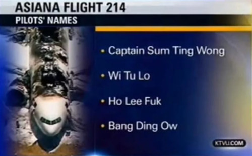 Bay Area news station KTVU just reported that the pilots of Asiana's disastrous flight 214 were the crack team of "Sum Ting Wong," "Wi Tu Lo," "Ho Lee Fuk," and "Bang Ding Ow."