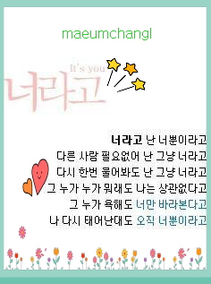 이 빗방울은 바로 너야...빗방울 수만큼이나 너를 생각해이런 내 마음 아니?비가 유난히도 많이 오는날은더욱더 너가생각나..너의 모습 그대로를 생각해..앞으로도 난 널 생각할거야..너의 모든것을..너만이 나에겐유일한 사람이니까....