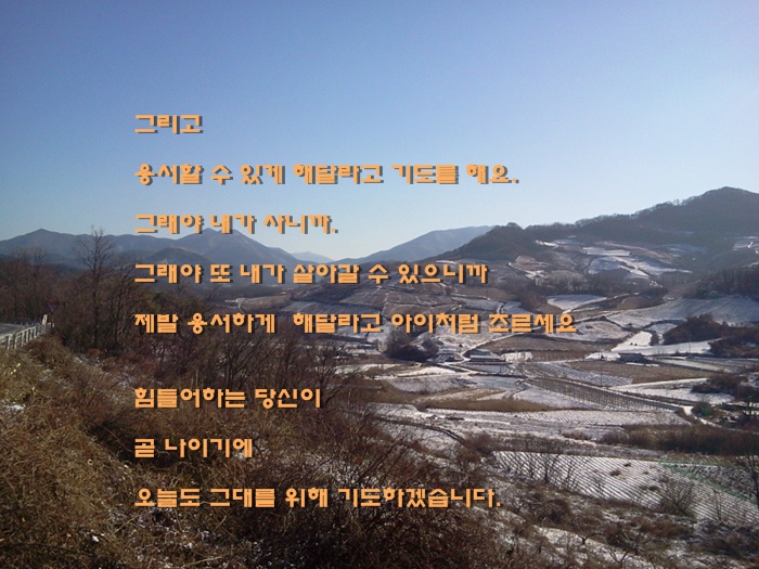사랑하는 사람을 보냈다고 너무 안타까워하거나 슬퍼하지말자. 인생은 결국 가는 것. 무엇이 영원한 것이 있으리. 그러려니 하고 살자.컴컴한 겨울 날씨에도 기뻐하고 감사하며 살자. 더러는 좋은 햇살 보여 줄 때가 있지 않던가? 그러려니 하고 살자.