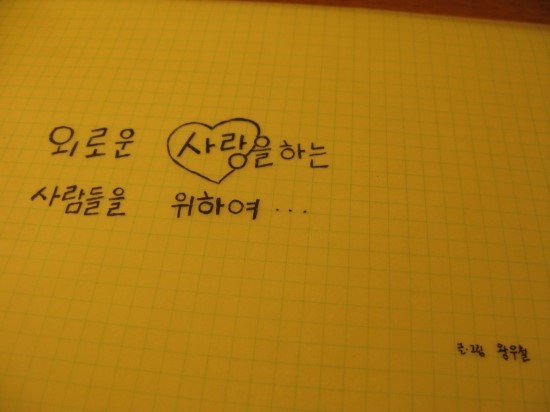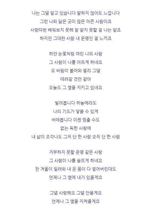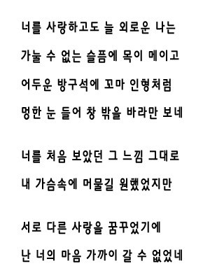 외로운 사랑없이항상 마음속에 머무는최고의 사랑 이뤄졋으면 하는 바램이눈물 끊임없이 흐르는이 소망 들어주시기를 바래여외 사랑이 아닌 영원한 사랑으로내일의 행복 함께하는 사랑을 이뤄주시기를.......