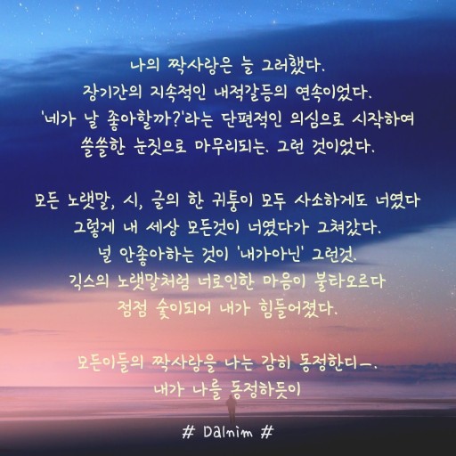 눈물로 채워지는 사랑이 아닌기쁨으로 외로운 사랑없이사랑의 소망 원없이 이뤄지는 @^ㅇ^@뜻 깊음의 사랑 끝없는 날들로써늘 곁에서 함께하는 영원한 사랑되시기를