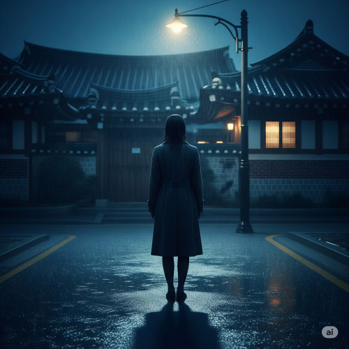 비 내리는 집 앞에 홀로 선 여자가