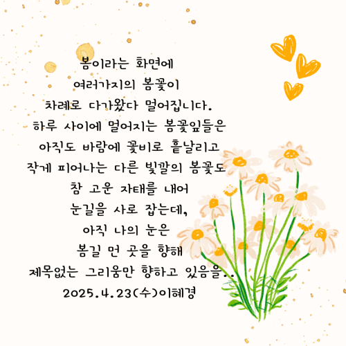 겨울이 요란하게 간 것일까? 봄이 요란하게 온 것일까? 꽤 많은 일들이 있었던 것 같은데 시간은 너무 빨라 모든 것을 잊게 만든다.댓글 0